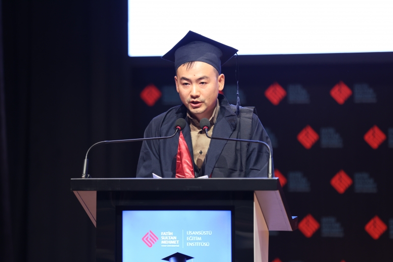 Törende, yüksek lisans ve doktora mezunları adına konuşma gerçekleştiren Geleneksel Türk Sanatları Tezli Yüksek Lisans ve Sanatta Yeterlik programları mezunu Chuanyı Leı ise duygularını şu sözlerle ifade etti: “Rivayete göre, Hz. Muhammed (SAV) “İlmi Çin’de de olsa talep ediniz.” diye buyurmuştur. Ben ise tam ters bir yönde; Çin’den Türkiye’ye geldim. Birçok kişi bana “Neden Türkiye?” diye sordu. Daha önce hep Çin’de henüz yeterince çalışılmamış bir akademik alan olan Türk ve İslâm sanatlarını öğrenmek için geldim” diye cevap verdim. Şimdi tekrar düşündüğümde, bunun belki de bir tevafuk ve benim görevim olduğunu anlıyorum.” dedi.